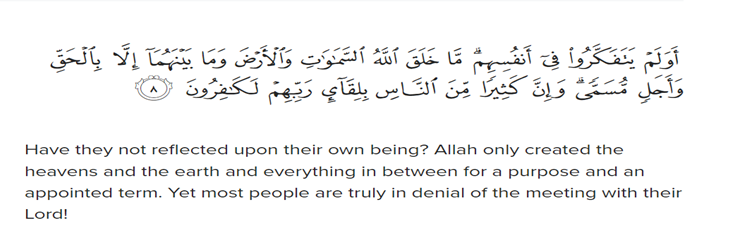 Allah says look into yourself and then look up = it’s a system, You will find purpose (AL-rum 8)