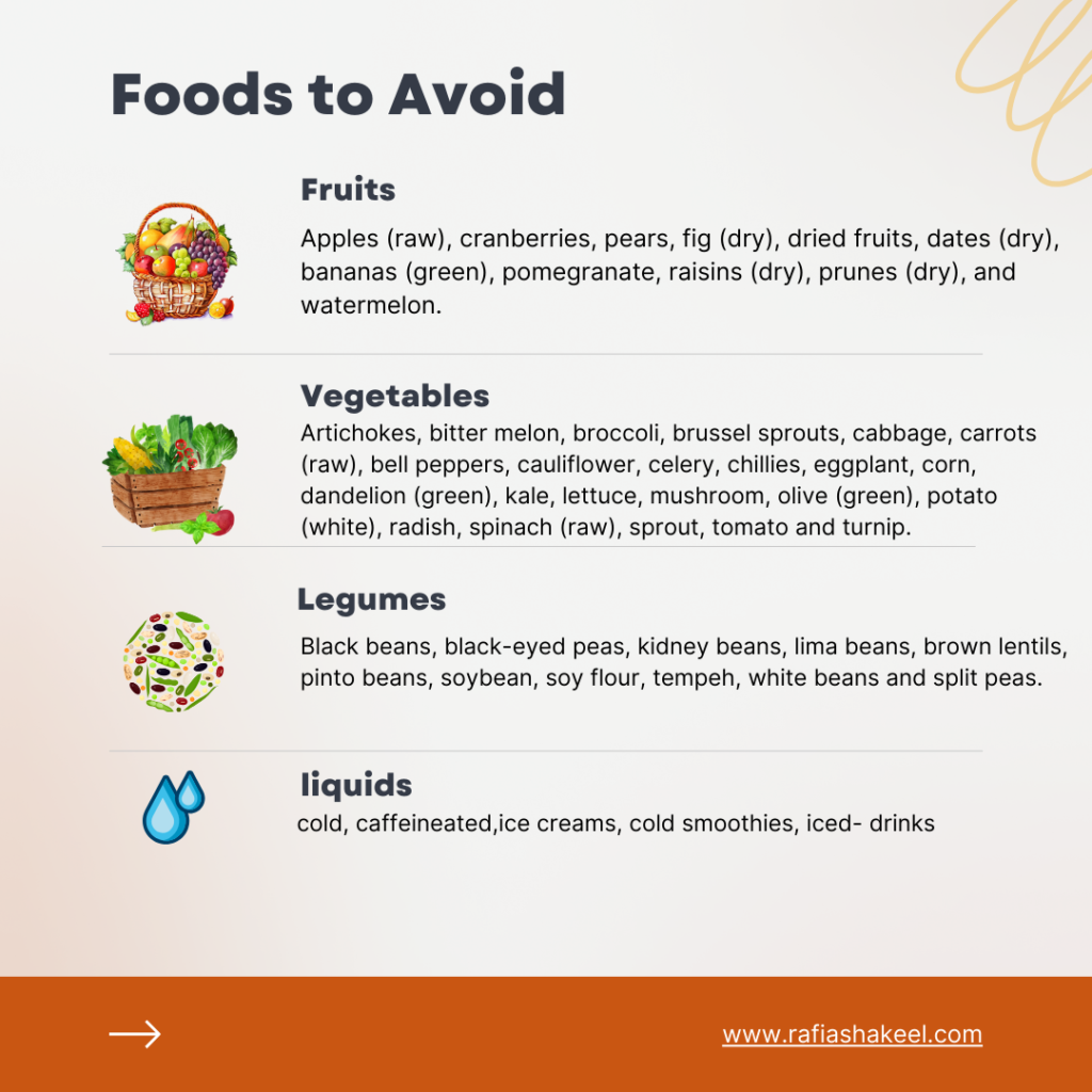 • Warm body temperature: consume warm & moist foods and drinks, teas